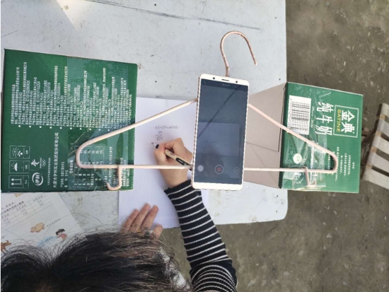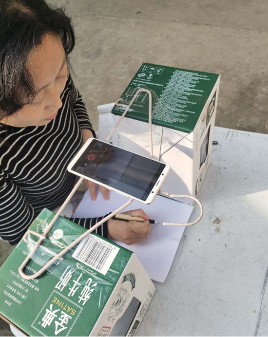 在備課時,朱霞很快遇到了難題:手機(jī)沒法固定,街上手機(jī)店又全部停業(yè),網(wǎng)上買的手機(jī)固定夾發(fā)不了貨。為了不耽誤學(xué)生上課,她想到用晾衣?lián)?、牛奶箱做成簡易支架,組裝后居然效果不錯。就這樣,一個晾衣?lián)?、兩個牛奶箱和一部手機(jī)組成了她的“三尺講臺”。