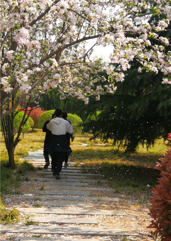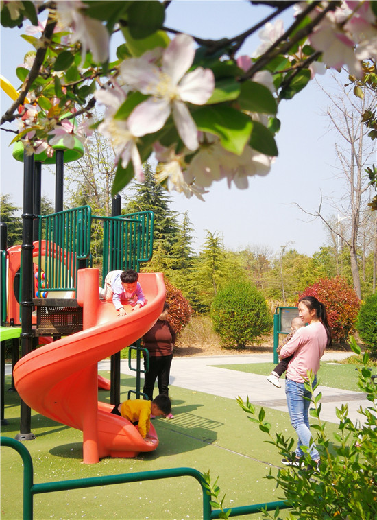 3月24日,周口公園內櫻花、海棠、桃花、紫荊花爭相綻放,在綠樹的映襯下,遠看猶如濃彩重墨的百花圖,不少市民來此賞花游玩。