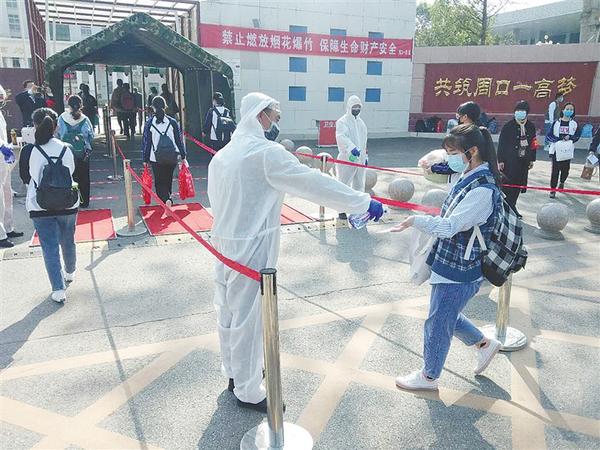 圖一 4月7日,周口一高三年級(jí)學(xué)生在入校前測(cè)量體溫。當(dāng)天,我市高中三年級(jí)學(xué)生正式復(fù)課,廣大學(xué)生按照疫情防控要求,錯(cuò)峰、錯(cuò)時(shí)有序入校。 記者 張洪濤 攝