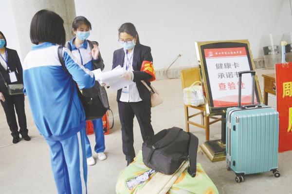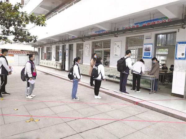 4月20日6時(shí)50分,記者在周口四中門口看到,學(xué)生們?cè)诩议L(zhǎng)的陪伴下陸續(xù)趕來(lái),按照學(xué)校提前下發(fā)的入校流程,在校門口間隔一米距離有序排隊(duì)。然后,他們按規(guī)定依次遞交健康承諾表后,在值班教師的引導(dǎo)下,通過(guò)大門兩側(cè)設(shè)置的體溫測(cè)試通道入校,每個(gè)通道處都有工作人員負(fù)責(zé)引導(dǎo)學(xué)生、噴灑消毒液。