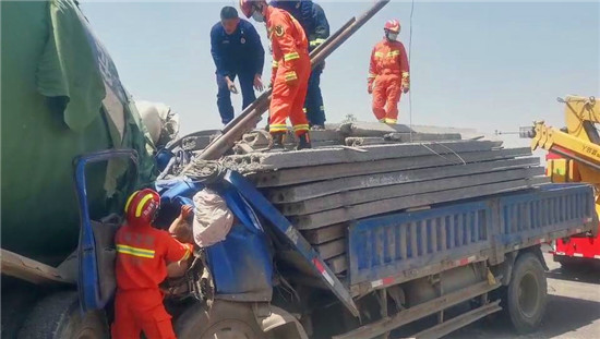4月26日11時許,西華縣逍遙鎮(zhèn)加河灘村穎河橋發(fā)生一起車禍,一輛拉石板的貨車和一輛水泥罐車相撞,貨車在強大的慣性下車頭嚴重變形,司機被困車中,而貨車的駕駛室也被由于慣性發(fā)生前傾的石板壓住,情況十分緊急。周口市消防救援支隊西華縣消防大隊接到報警后立即出動2車10人趕赴現(xiàn)場展開救援。