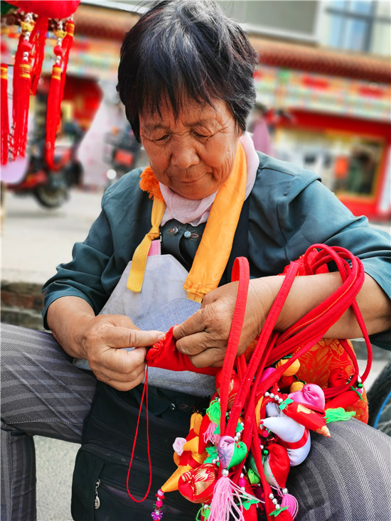 6月4日,呂大媽在懸掛剛做好的香包。端午節(jié)臨近,我市城區(qū)大街小巷,各種形象生動(dòng)、精致可人的香包深受市民喜愛(ài)。
