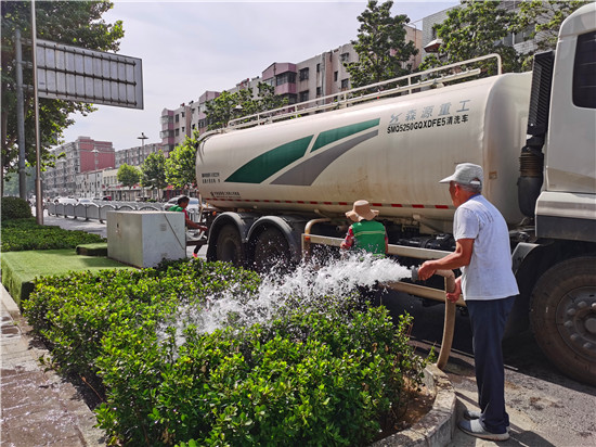 6月4日,園林工人在市區(qū)七一路為綠化帶內(nèi)植被澆水“解渴”。近期我市持續(xù)高溫天氣,為應(yīng)對(duì)連續(xù)高溫,綠化部門加大對(duì)綠化樹(shù)木的澆灌灑水頻次,為城區(qū)的花草樹(shù)木“消暑”, 確保綠化植物的存活率。