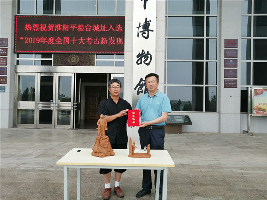6月12日,在2020年“文化和自然遺產日”即將來臨之際,淮陽區(qū)市級非物質文化傳承人靳偉向市博物館捐贈“抗疫”泥塑作品《逆行之守護者》《隔空擁抱》,以表達藝術家對新冠肺炎疫情期間全國醫(yī)務人員無私精神的敬意。周建山館長向靳偉頒發(fā)榮譽證書。