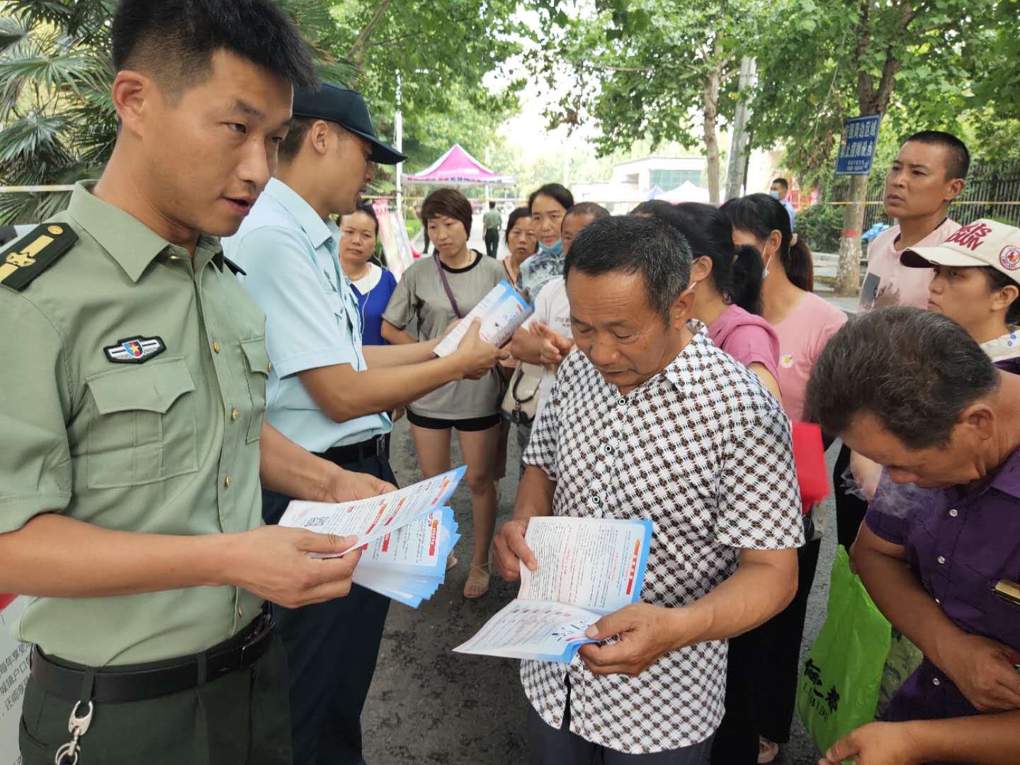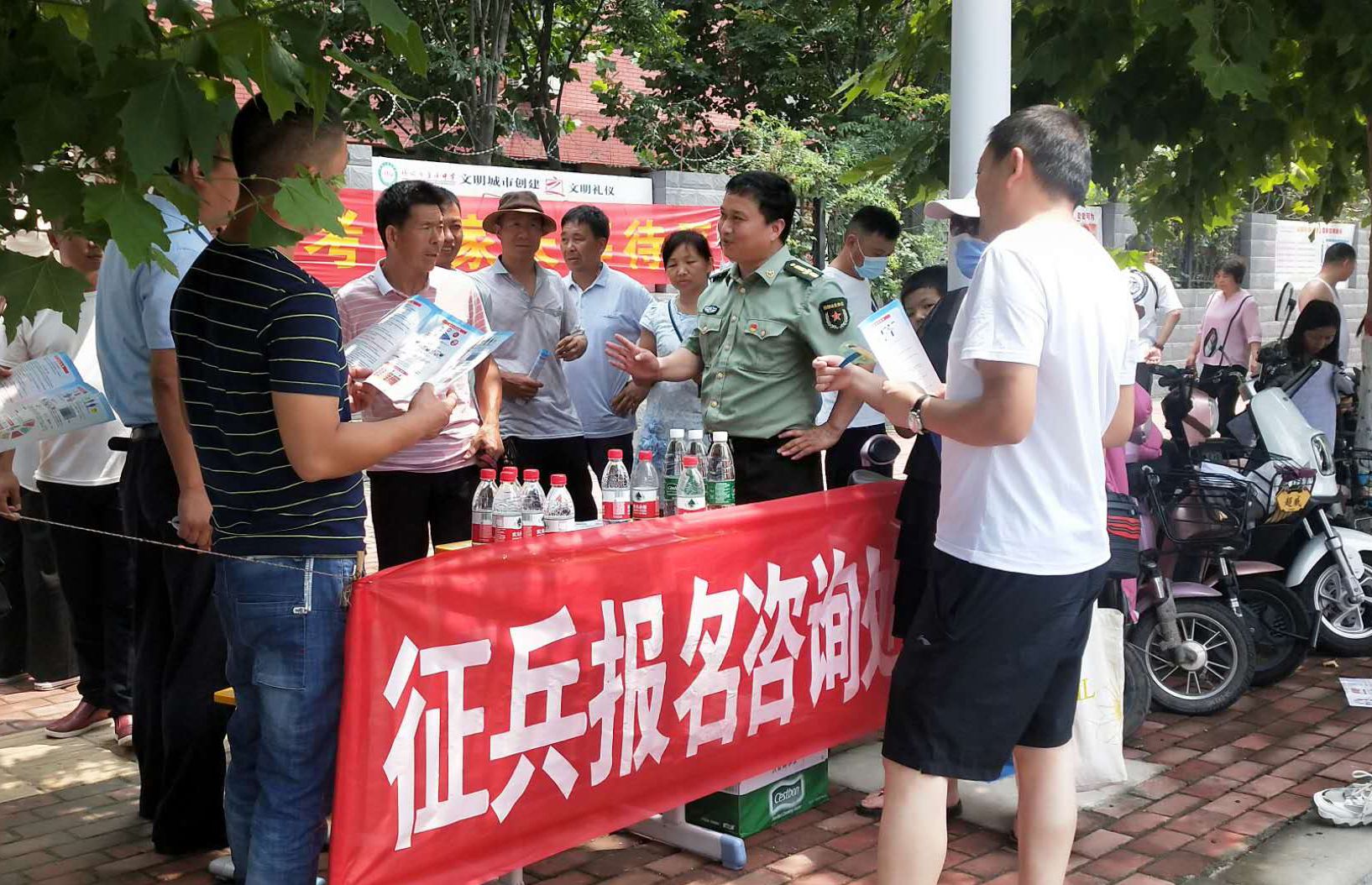 為強(qiáng)化全民依法履行兵役義務(wù)觀念,激發(fā)廣大適齡青年特別是高學(xué)歷青年參軍入伍熱情,7月7日至8日,項(xiàng)城市人武部組織機(jī)關(guān)所有人員和21個(gè)鎮(zhèn)(街道)辦事處武裝部長等36人,深入各考點(diǎn)設(shè)立征兵政策咨詢點(diǎn),懸掛宣傳標(biāo)語、擺放宣傳版面,開展以助力高考為目的的大學(xué)生征兵宣傳活動(dòng)。為不影響考場(chǎng)秩序避免打擾高考,7月7日全天,參加宣傳的工作人員悄悄走進(jìn)家長等待區(qū),現(xiàn)場(chǎng)向廣大考生家長以及過往群眾發(fā)放《應(yīng)征入伍明白卡》、《大學(xué)生入伍優(yōu)惠政策》等征兵宣傳資料,并接受咨詢。7月8日下午5點(diǎn)30分后,為期兩天的高考結(jié)束后考生放松的走出考場(chǎng)大門之際,所有人員同時(shí)守在大門外,一邊給考生發(fā)放宣傳資料,一邊接受學(xué)生咨詢和報(bào)名,給他們講解大學(xué)生入伍政策、法規(guī),介紹“應(yīng)征入伍的政治、文化、身體和年齡條件”、“報(bào)名程序”、“就業(yè)安置”等相關(guān)內(nèi)容,鼓勵(lì)高中畢業(yè)生帶著成績和文化知識(shí)投身軍營、報(bào)效祖國。