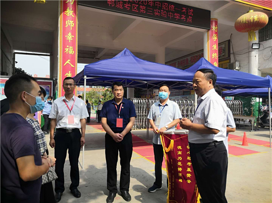 “該中招考試了,俺孩子錦博卻在7月8日騎電動車摔斷了腿,這該咋辦,我和孩子他爸都愁壞了,沒想到我們一家在7月14號下午來第三實驗中學(xué)看考場時候,第三實驗中學(xué)考點主考付曄和第三實驗中學(xué)校長孟杰發(fā)現(xiàn)了我們的情況后,對我們說:“你們放心,孩子考試的事情就包在我們身上?!绷⒓窗才艑W(xué)校李蘭君老師、張子江老師專門護(hù)送孩子進(jìn)出考場,并安撫孩子專心考試,不要有什么心理負(fù)擔(dān)。聽孩子說這幾場考試,李蘭君老師和張子江老師都是背著孩子上下樓、去廁所、出考場,對于你們的幫助,我真不知道該說什么好,真的太感謝你們了,謝謝!謝謝!中考考生劉錦博媽媽眼含淚花動情地說,并把一面寫著“暖心助考贏贊譽(yù),德高為范鑄師魂”的錦旗交給鄲城縣教體局黨組書記、局長羅明黨手中。