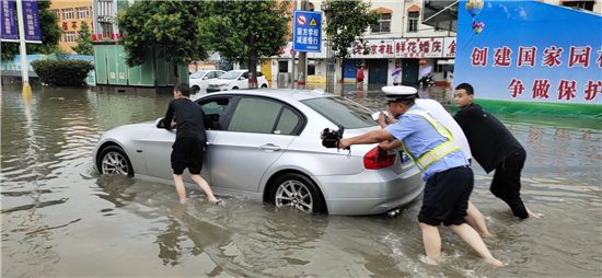 推車、砍樹(shù)、疏導(dǎo)……直屬各大隊(duì)民警分赴市區(qū)眾多積水路口路段,或冒雨指揮交通、或徒手清理下水道堵塞物及路面雜物、或在水深過(guò)膝路段幫助老人和小孩過(guò)馬路。
