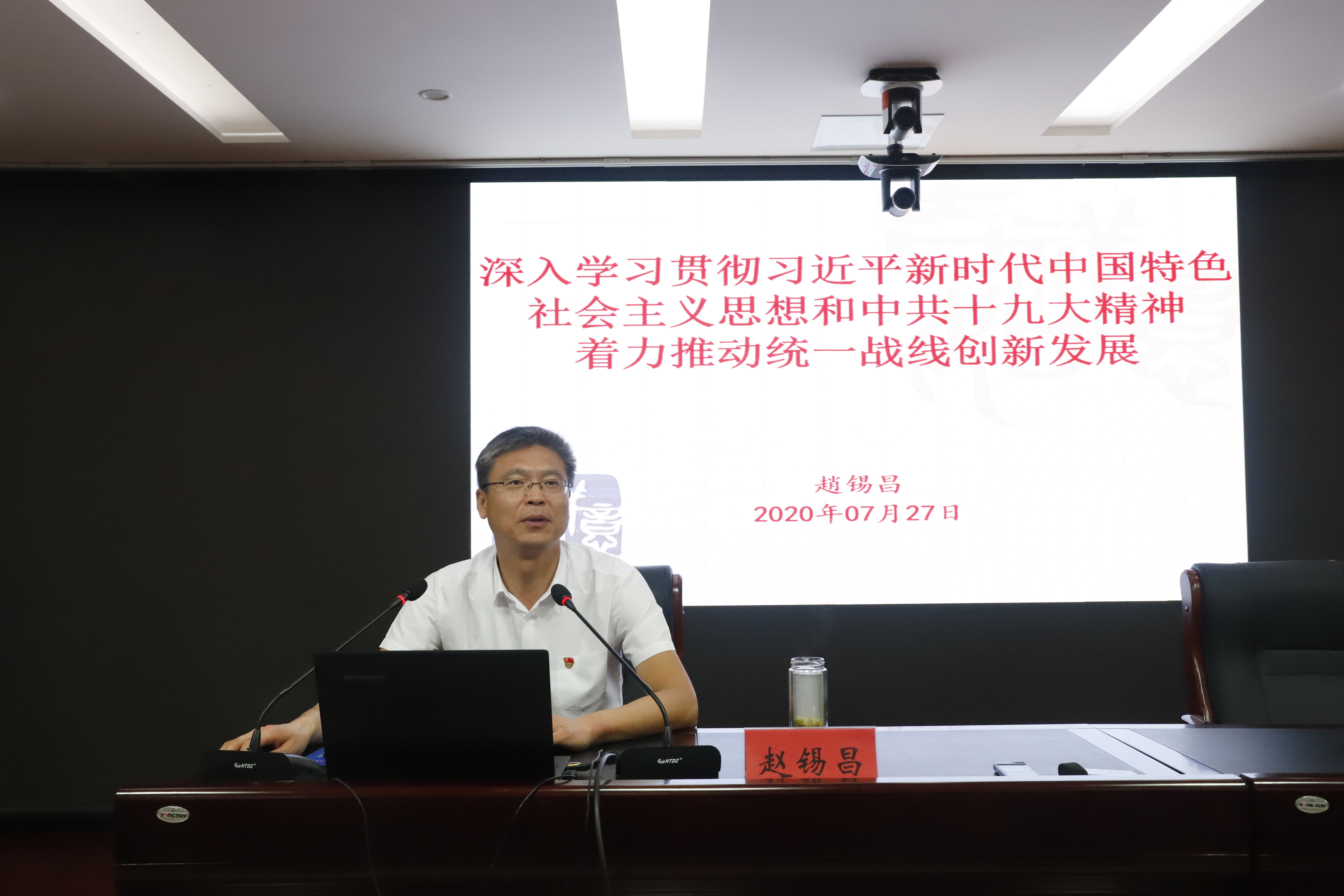 趙錫昌以《深入學習貫徹習近平新時代中國特色社會主義思想和中共十九大精神著力推動統(tǒng)一戰(zhàn)線創(chuàng)新發(fā)展》為題,圍繞新時代統(tǒng)一戰(zhàn)線的定位、新時代統(tǒng)一戰(zhàn)線的要求、新時代統(tǒng)一戰(zhàn)線的任務(wù)、新時代統(tǒng)戰(zhàn)工作的方法等四個方面,就統(tǒng)一戰(zhàn)線的性質(zhì)、主題、功能、方針、工作方法、對象范圍和中央對統(tǒng)戰(zhàn)工作的要求等重點內(nèi)容,為參訓黨員干部了一堂生動的理論知識輔導課。