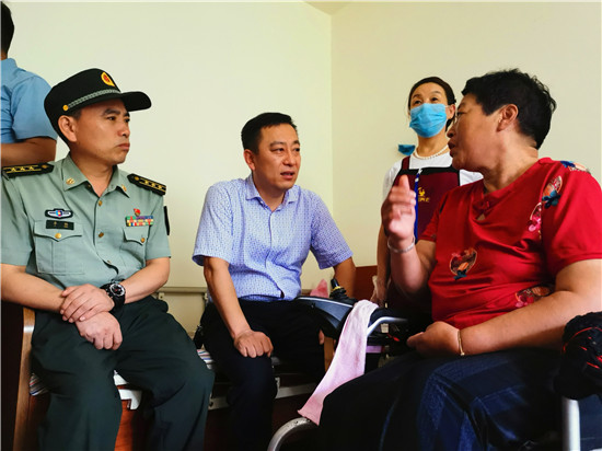 走進(jìn)位于太昊路上的周口市老年護(hù)理院,院內(nèi)整潔有序、花蕊吐香鳥鳴聲聲,小徑通幽處的涼亭內(nèi)三五老人打牌、聊天,一副愜意安詳?shù)纳顖?chǎng)景。在侯國領(lǐng)母親王玉勤居住的房間內(nèi),李揚(yáng)、孫光濤等人坐在床邊與她聊天談心,看到這么多人來慰問她,王玉勤眼中流下了感動(dòng)的眼淚,她對(duì)慰問人員表示感謝,說自己來護(hù)理院近一年來,吃住條件都不錯(cuò),護(hù)理院照顧的無微不至,身體一天天恢復(fù),閑暇時(shí)還能不依賴輪椅自己走上一段路。她激動(dòng)地說:“感謝黨和政府的親切關(guān)懷,我最大的愿望是希望倆兒子永遠(yuǎn)聽黨的話,在部隊(duì)安心服役、再立新功,用優(yōu)異的成績回報(bào)黨和政府對(duì)我們?nèi)业年P(guān)愛?!?/p>