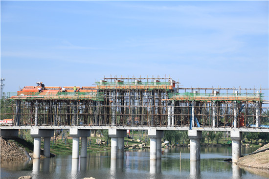 8月13日,在河南省周口市商水縣森林公園景觀橋施工工地,工人們正在高溫下緊張施工。