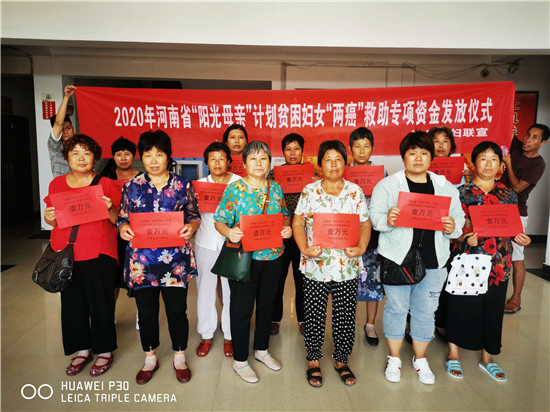 據(jù)悉,此次發(fā)放的公益金來自于河南省陽光母親貧困婦女兩癌救助金。其救助對象是經(jīng)過有檢查資質(zhì)的醫(yī)療機構(gòu)確診、患有宮頸癌ⅡB以上或浸潤型乳腺癌的農(nóng)村貧困婦女,救助標準為每人一次性救助1萬元。