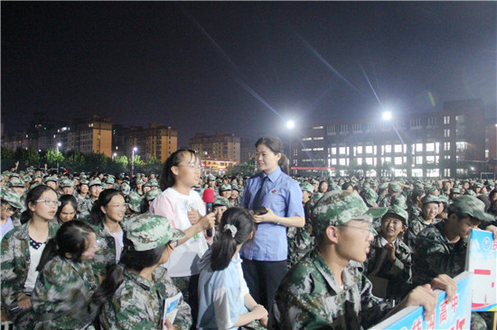 "你們正處于人生的花季,知識(shí)是養(yǎng)分,那么法律知識(shí)就好比是殺蟲劑,要學(xué)好,更要用好,要做到知法、守法、用法,在法治護(hù)航下遠(yuǎn)離校園欺凌,拒絕電信網(wǎng)絡(luò)詐騙,不義之財(cái)不可取,防范之心不可無……”。8月29日晚上7點(diǎn),黃昏謝去,暮色已經(jīng)模糊起來了,伴著淺淺的晚霞,扶溝縣檢察院檢委會(huì)專職委員郁玉琴帶領(lǐng)該院“女檢察官特別護(hù)未隊(duì)”的三名女檢察官到扶溝高中為正在接受軍訓(xùn)的1600余名高一新生們上了一堂別開生面的法治課。