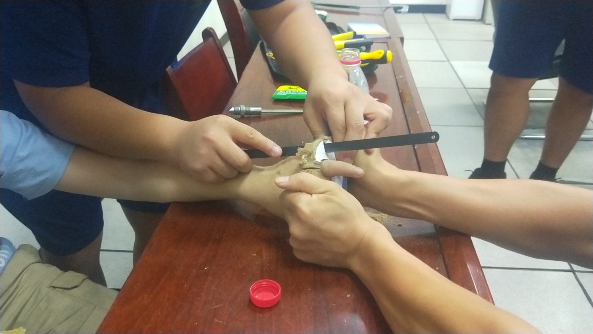 看到救援人員,小男孩十分害羞,有點不好意思?!拔铱醋雷由嫌袀€孔,就是想看看手指能不能伸進去,結(jié)果就拔不出來了。”救援人員經(jīng)觀察發(fā)現(xiàn),小男孩左手無名指被卡在課桌木板上的小孔里,木板已被裁下,木板材質(zhì)為鋸末壓縮板,此時小男孩手指被卡部位周圍已發(fā)生腫脹必須馬上處理。救援人員利用鋼鋸將木板一點點鋸開,然后又用鉗子用力將木板夾開,經(jīng)過3分鐘救援,成功將禁錮小男孩手指的木板摘除。看到木板被從手上取下,男孩長長地舒了口氣。