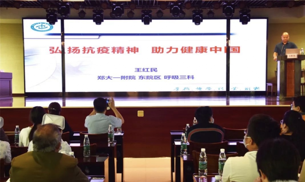王紅民教授曾經參加河南省援鄂醫(yī)療隊,他給大家分享了在武漢第一家方艙醫(yī)院——江漢方艙醫(yī)院工作時的抗疫故事,當王教授說起援鄂醫(yī)療隊“疫情不退,絕不言歸”的口號時,臺下響起雷鳴般的掌聲。
