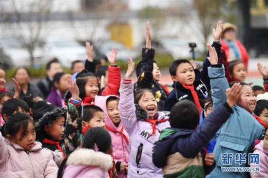 重慶市石柱土家族自治縣中益鄉(xiāng)小學(xué)的同學(xué)們在文藝演出現(xiàn)場與演員互動。當(dāng)日,“我的中國夢——文化進萬家”中國視協(xié)文藝志愿服務(wù)小分隊走進中益鄉(xiāng)小學(xué),為師生們帶來精彩的文藝表演(2019年12月12日攝)。新華社記者王全超 攝