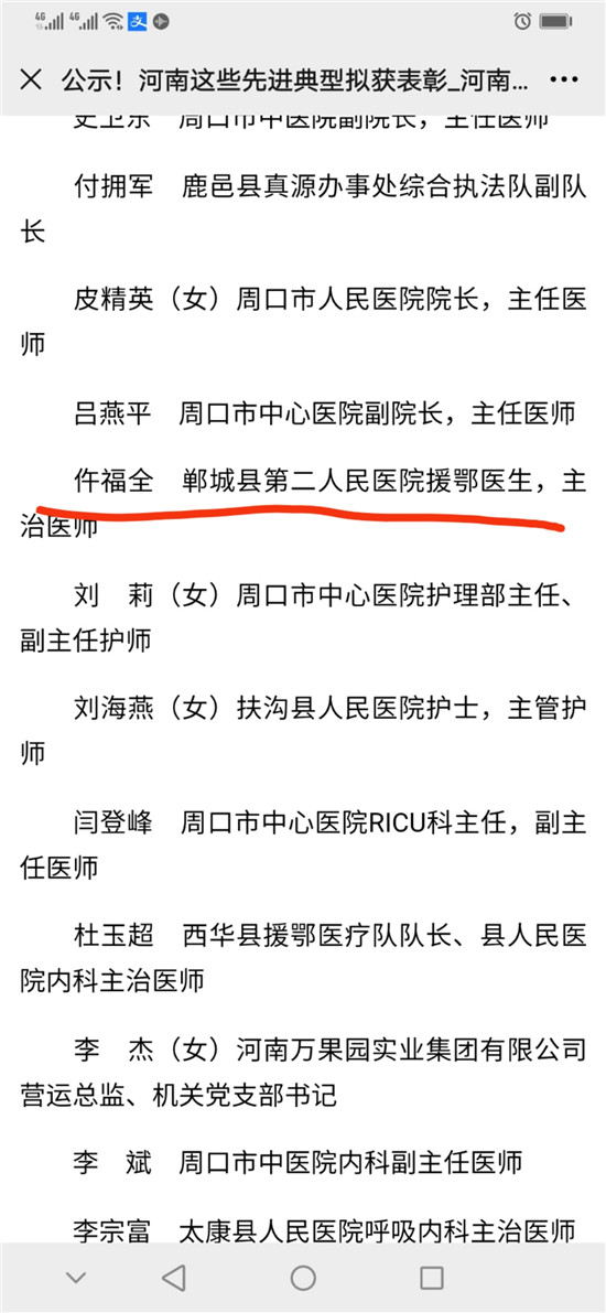 10月10日,河南省委、省政府表彰了一批抗擊新冠肺炎疫情先進(jìn)個(gè)人、河南省抗擊新冠肺炎疫情先進(jìn)集體、河南省優(yōu)秀共產(chǎn)黨員、河南省先進(jìn)基層黨組織。其中,鄲城縣副縣長(zhǎng)肖煒,縣第二人民醫(yī)院援鄂醫(yī)生、主治醫(yī)師仵福全,縣人民醫(yī)院重癥醫(yī)學(xué)科ICU主任、副主任醫(yī)師王劍橋3位同志,被評(píng)為河南省抗擊新冠肺炎疫情先進(jìn)個(gè)人。