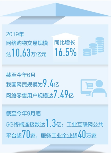 截至2020年6月,我國(guó)網(wǎng)民規(guī)模為9.4億,網(wǎng)絡(luò)零售用戶規(guī)模達(dá)7.49億。2019年網(wǎng)絡(luò)購(gòu)物交易規(guī)模達(dá)10.63萬億元,同比增長(zhǎng)16.5%。截至今年9月底,5G終端連接數(shù)達(dá)到1.3億;制造業(yè)數(shù)字化轉(zhuǎn)型穩(wěn)步前進(jìn),工業(yè)互聯(lián)網(wǎng)公共平臺(tái)超過70家,服務(wù)的工業(yè)企業(yè)超過40萬家……如今,數(shù)字經(jīng)濟(jì)蓬勃發(fā)展,成為經(jīng)濟(jì)發(fā)展的新增長(zhǎng)點(diǎn),產(chǎn)業(yè)數(shù)字化與數(shù)字產(chǎn)業(yè)化的基礎(chǔ)更加堅(jiān)實(shí),不斷為高質(zhì)量發(fā)展注入新動(dòng)能。
