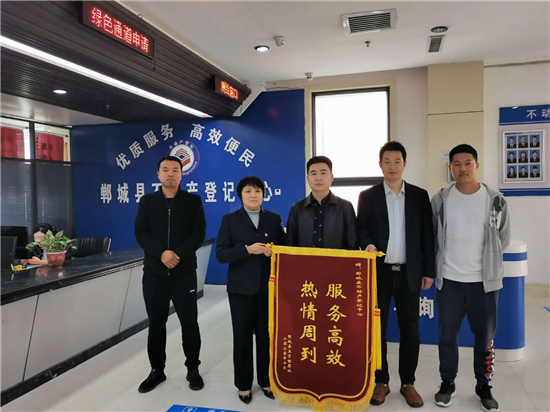 10月20日,鄲城縣王子世界城房地產(chǎn)開(kāi)發(fā)企業(yè)代表將一面繡有“服務(wù)高效、熱情周到”的錦旗,送到鄲城不動(dòng)產(chǎn)登記中心窗口,對(duì)鄲城縣不動(dòng)產(chǎn)登記中心干部職工,主動(dòng)作為、心系企業(yè)、熱情服務(wù)的工作態(tài)度表示感謝。