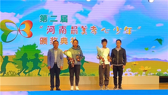 10月20日,河南省第二屆“河南最美孝心少年”頒獎典禮在河南省實驗學(xué)校鄭東小學(xué)舉行,全省表彰10名“河南最美孝心少年”,分別頒發(fā)獎杯、證書和1萬元獎勵。省教育廳副廳長毛杰等領(lǐng)導(dǎo)為孝心少年頒獎并合影留念。鄲城縣汲水二中學(xué)生薛勝楠光榮受獎。