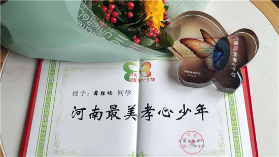 “正是天真爛漫的年紀(jì),已有歷經(jīng)歲月的坦然。在苦難中成長,在風(fēng)雨中自強。寒門至孝,貧窮遮不住你內(nèi)心的光芒。嘗罷艱辛,方能破繭成蝶、百煉成鋼。你是‘河南最美孝心少年’——薛勝楠?!边@是組委會給薛勝楠的頒獎詞。
