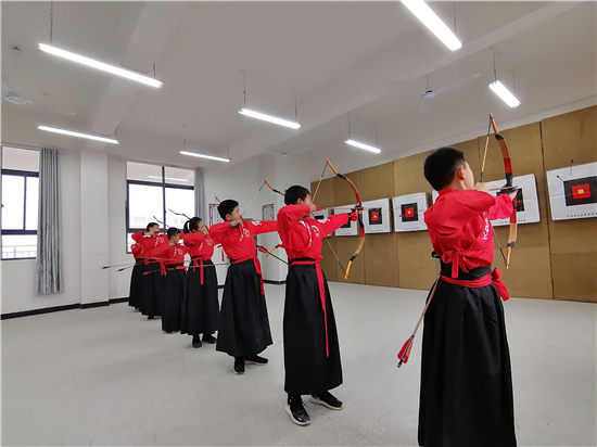 在皮營學(xué)校活動室,學(xué)校舞蹈社團的小朋友展示了傳統(tǒng)儀式《鹿鳴》,深情的演繹,展示了他們對國學(xué)經(jīng)典的理解。禮射是禮樂文明重要組成部分,習(xí)射先習(xí)禮,射以觀德。習(xí)射可以強健體魄,其中還蘊含了眾多古人先賢的智慧。皮營學(xué)校禮射興趣班的小朋友進行禮射表演,隨著挾矢,正筈,審固,舉弓,引彀,發(fā)矢,斂弓,執(zhí)弦等一系列指令,拈弓搭弦展示禮射八法。在這里,學(xué)生們通過不同方式的展示,詮釋自己對“禮”“樂”的理解和認知。