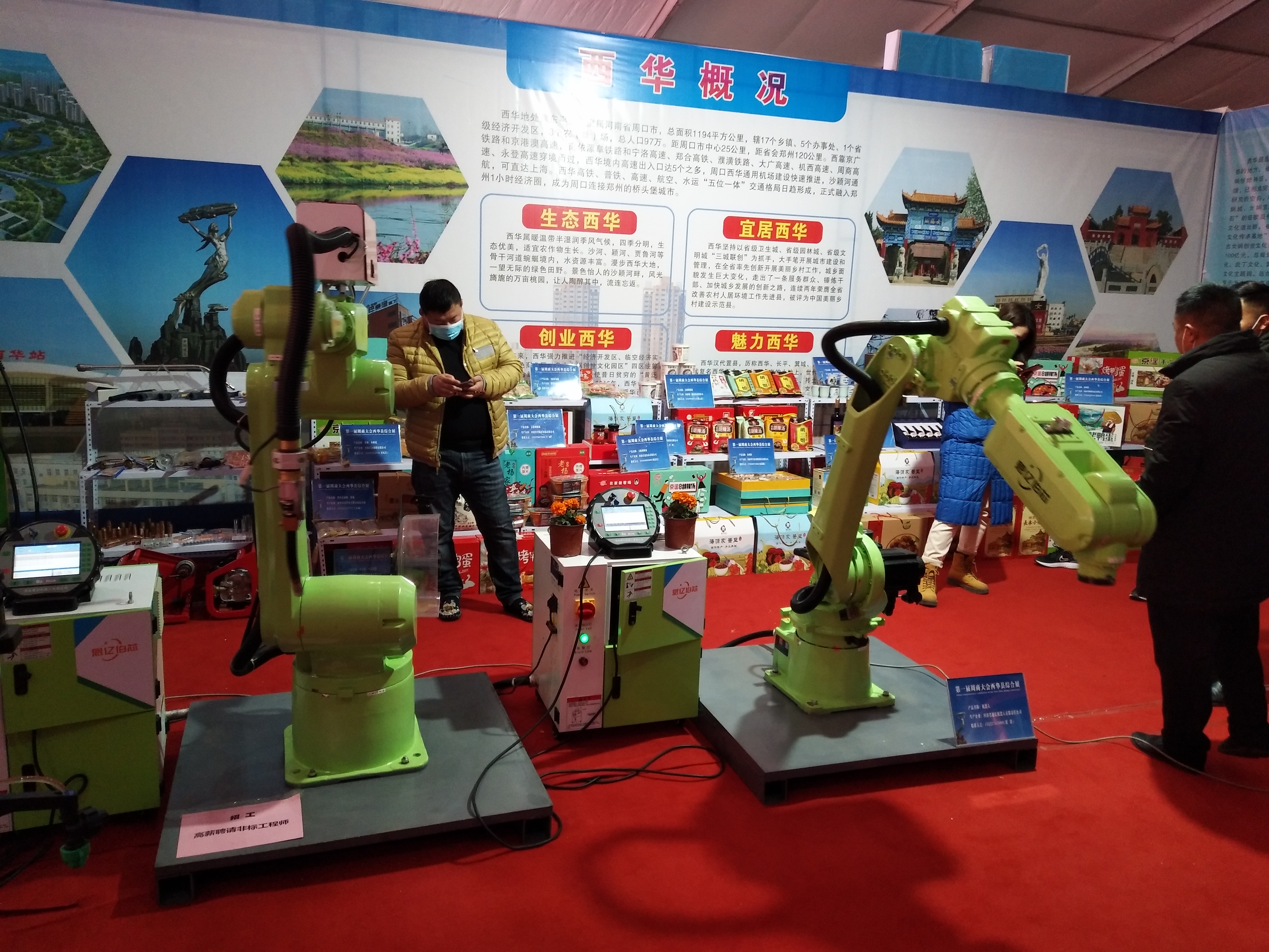 在西華縣展位,兩個高約1.5米、通體綠色的機械手臂,向來參觀的市民揮舞著“手掌”。這兩個機械手臂來自河南省恩億伯芯機器人有限公司,系西華縣本土企業(yè)自主研發(fā)。據(jù)董事長劉濤介紹,展示的機械手臂里,帶防撞器的是焊接汽車等大型機械用的,另一個是碼垛搬運用的,一次能搬運20公斤重的貨物。該廠成立于2014年,與宇通、東風日產(chǎn)等大型廠商有深度合作,所研發(fā)的工業(yè)機器人在大理和天津等地均有運用。圍觀市民表示,若不是此次周商產(chǎn)品展示展覽會,還真不知道周口有這些高科技企業(yè),希望周商的科技力量讓更多人看到。②8