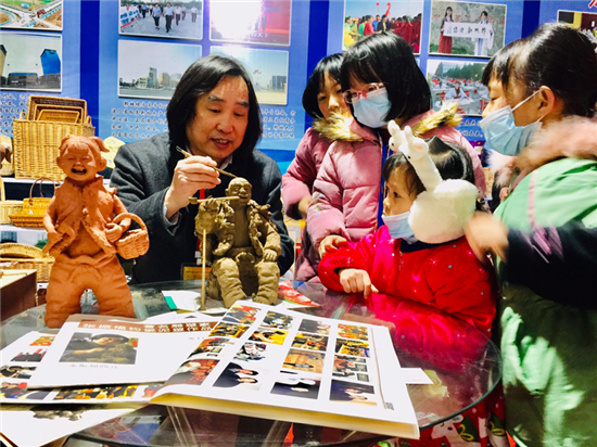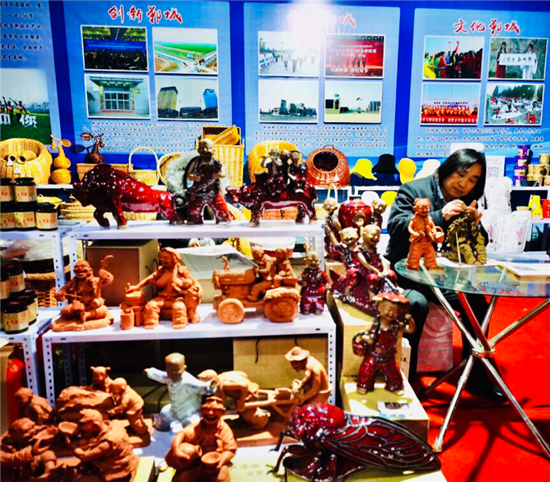 鄲城縣泥塑藝術(shù)大師張振福應(yīng)邀攜48件作品參加大會,成為展會的一大亮點。其中原生態(tài)泥塑作品18件,有《磨豆汁》《耕耘》《酒逢知己》《二胡曲》等,鈞瓷泥塑作品20件,有《大金蟬》《年年有余》《豫東娃》《瑞牛迎春》等。張振福的作品表現(xiàn)豫東的鄉(xiāng)村人物,作品突出個性,憨態(tài)可掬,深受觀眾的喜愛,大家紛紛駐足觀看。