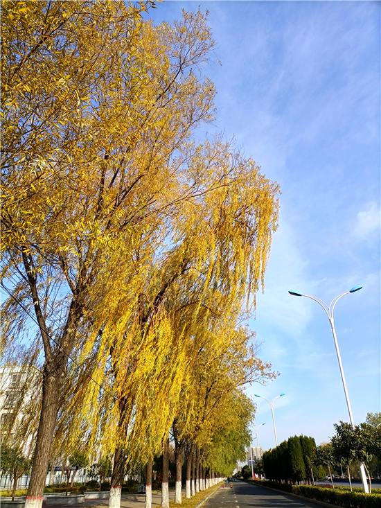 冬日暖陽照三川,垂柳更換鵝黃衫。無盡情思春可寄,千條萬條隨風(fēng)翩。12月15日,我市天氣晴朗,路旁一排排垂柳隨風(fēng)搖曳,像一個個舞動的小精靈,又像一團(tuán)團(tuán)鵝黃色的薄霧,如此美不勝收的風(fēng)景就像一幅畫,令人忍不住駐足欣賞。