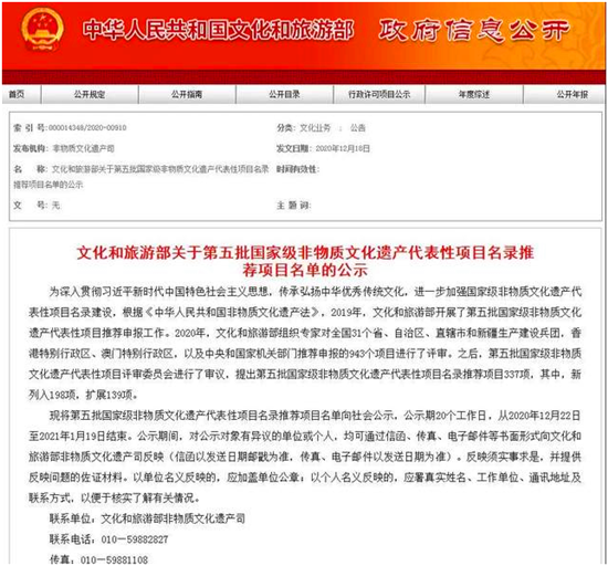 據(jù)了解,2019年,文化和旅游部開(kāi)展了第五批國(guó)家級(jí)非物質(zhì)文化遺產(chǎn)代表性項(xiàng)目推薦申報(bào)工作。2020年,文化和旅游部組織專(zhuān)家對(duì)全國(guó)31個(gè)省、自治區(qū)、直轄市和新疆生產(chǎn)建設(shè)兵團(tuán),香港特別行政區(qū)、澳門(mén)特別行政區(qū),以及中央和國(guó)家機(jī)關(guān)部門(mén)推薦申報(bào)的943個(gè)項(xiàng)目進(jìn)行了評(píng)審。之后,第五批國(guó)家級(jí)非物質(zhì)文化遺產(chǎn)代表性項(xiàng)目評(píng)審委員會(huì)進(jìn)行了審議,提出第五批國(guó)家級(jí)非物質(zhì)文化遺產(chǎn)代表性項(xiàng)目名錄推薦項(xiàng)目337項(xiàng),其中,新列入198項(xiàng),擴(kuò)展139項(xiàng)。