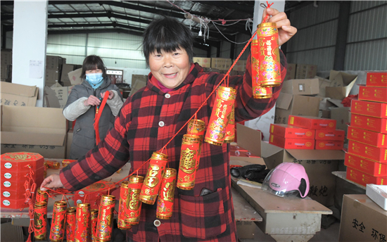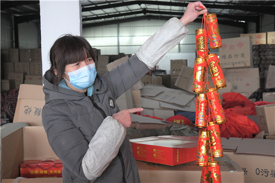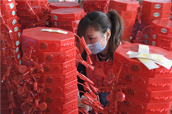 2月2日,在商水縣魏集鎮(zhèn)產(chǎn)業(yè)扶貧基地一帆工藝制作工廠,村民正在生產(chǎn)安全、環(huán)保、無污染的電子鞭炮。春節(jié)臨近,不能燃放傳統(tǒng)鞭炮的市民非常喜歡這種高科技替代產(chǎn)品,產(chǎn)品供不應(yīng)求。③2