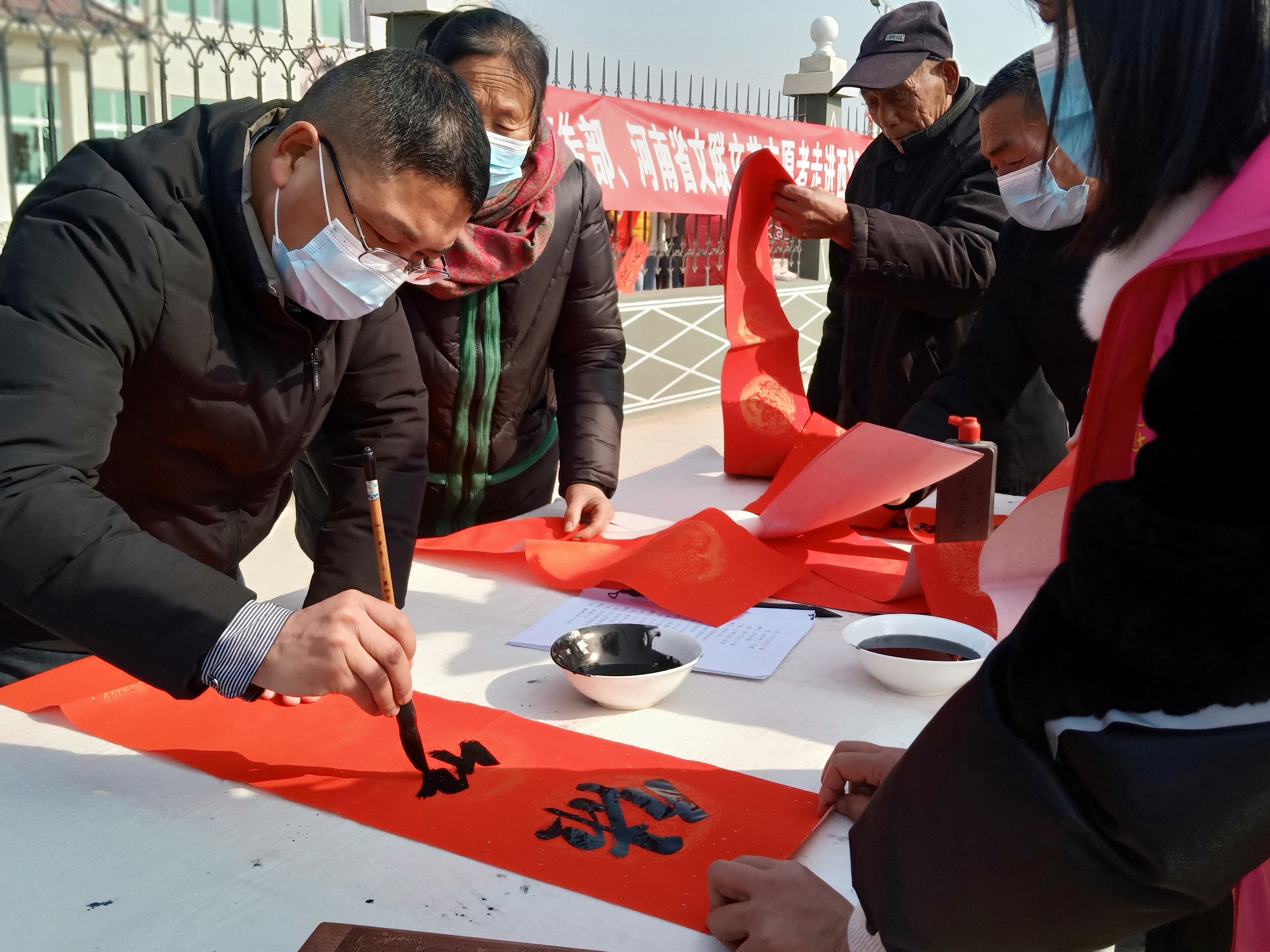 一大早,半截樓村新時(shí)代黨群服務(wù)中心樓前大院里人頭攢動(dòng)、歡聲笑語、翰墨飄香。一邊是省文聯(lián)志愿者義寫春聯(lián)送福,一邊是文藝志愿者文藝培訓(xùn)。村民們喜領(lǐng)一副副散發(fā)著墨香的大紅春聯(lián),臉上洋溢著幸福喜悅的笑容。