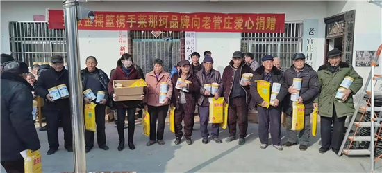 “這是在安徽金搖藍(lán)公司工作的老官莊村人王北領(lǐng)、王建立攜手萊那珂奶粉企業(yè)慰問(wèn)鄉(xiāng)親們吶!”武金英老人一臉幸福。據(jù)悉,這次慰問(wèn)的對(duì)象是老官莊貧困戶(hù)、60歲以上老人及困難群眾,慰問(wèn)捐贈(zèng)的禮品為奶粉240桶,價(jià)值十萬(wàn)余元。同時(shí),老官莊新當(dāng)選地村黨支部書(shū)記王杰華也出資5000元,為村里的60歲以上老人及困難群眾購(gòu)買(mǎi)大米120袋,用行動(dòng)為老官莊老人送去節(jié)日的祝福。