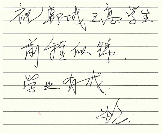 朱婷雖然很少回家,但是一直關(guān)注老家鄲城的發(fā)展變化,特別關(guān)注鄲城的教育發(fā)展,當(dāng)她得知鄲城三高率先提煉出“孝、勤、韌、忠、濟(jì)”為核心的朱婷精神,并把這種精神作為鄲城三高學(xué)子的精神引領(lǐng)時(shí)非常感動(dòng),為鄲城三高始終堅(jiān)持立德樹人的教育理念而高興,為鄲城三高學(xué)子的拼搏進(jìn)取精神而欣慰,為鄲城三高辦學(xué)成果而點(diǎn)贊,并欣然寫下:“ 祝鄲城三高越來越好,圓農(nóng)家子弟大學(xué)夢(mèng);祝鄲城三高學(xué)生前程似錦,學(xué)業(yè)有成。”