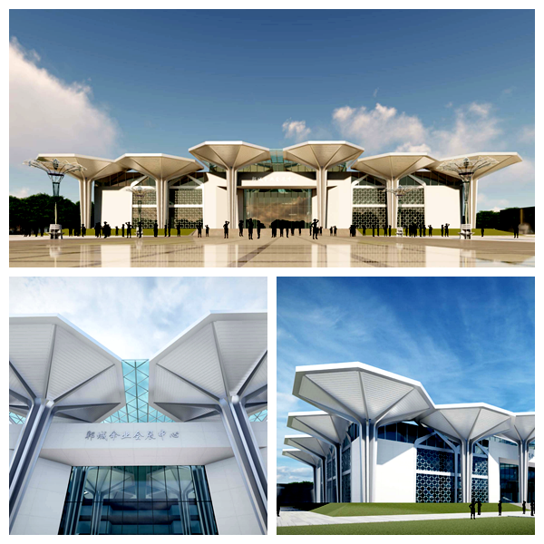 其中,傘業(yè)產(chǎn)業(yè)園電子商務(wù)服務(wù)中心項(xiàng)目由中國一冶承建,會(huì)展中心的設(shè)計(jì)概念以“傘啟鄲興”為主題,基于對(duì)本土特色文化的深入解讀、同時(shí)結(jié)合“傘”的具體特征,提煉傘蓋、傘骨、傘柄的特殊形象為基本元素。建筑主立面以八個(gè)巨大傘形構(gòu)架依次展開,巨型的尺度、新穎的造型有極強(qiáng)的昭示性,裝飾幕墻八邊形的單元分割也隱喻了傘蓋的造型,創(chuàng)新的視覺形象為傘業(yè)產(chǎn)業(yè)園增加了新的注解。會(huì)展中心整體的建筑風(fēng)格充分展示了鄲城傘業(yè)產(chǎn)業(yè)園的核心價(jià)值,形成獨(dú)具特色的地標(biāo)形象。