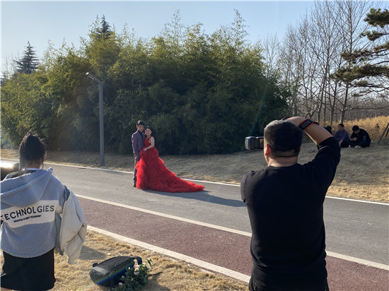 優(yōu)美的景色不是市民享受春光的好去處,也是拍攝婚紗照的好地方。“老婆靠老公近一點、再近一點,微笑、嗯不錯?!币粚π氯苏谂幕榧喺?,紅色的婚紗與自然的風景融在一起,盡顯新娘的美麗。在植物園里,拍一組森系風格的婚紗照很是漂亮,春風將“調(diào)色板”打翻,一對新人的甜蜜愛情就這樣被定格在這春天里。