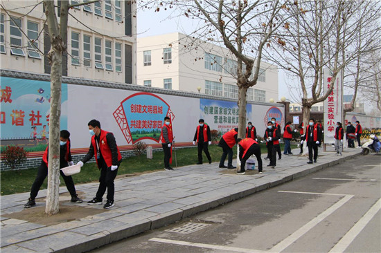 另一邊,黨員教師則手拿滾刷,給校門口公園北路兩側(cè)的法桐樹刷上白灰、紅漆,宛若給樹穿了件新衣。伴隨著他們忙碌的身影,一排排法桐樹煥然一新,整齊的“紅白裙子”看上去格外漂亮。