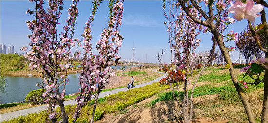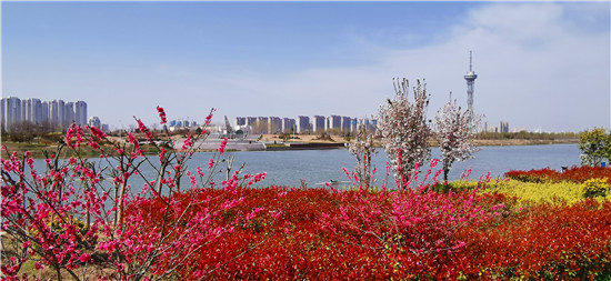 近日,在春花和藍天碧水映襯下,沙潁河兩岸桃花、海棠、石楠、櫻桃花競相綻放,沙潁河兩岸美如畫。