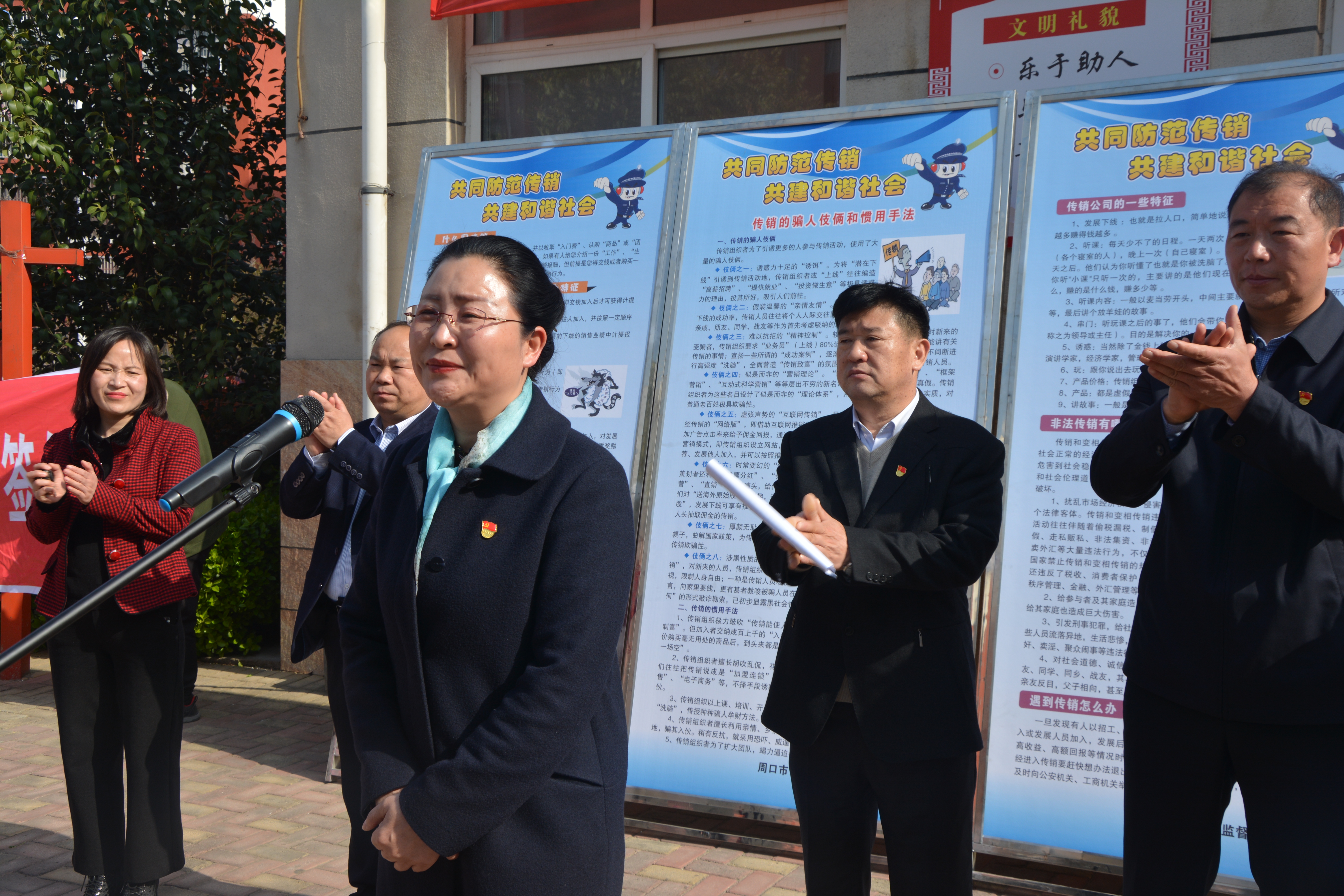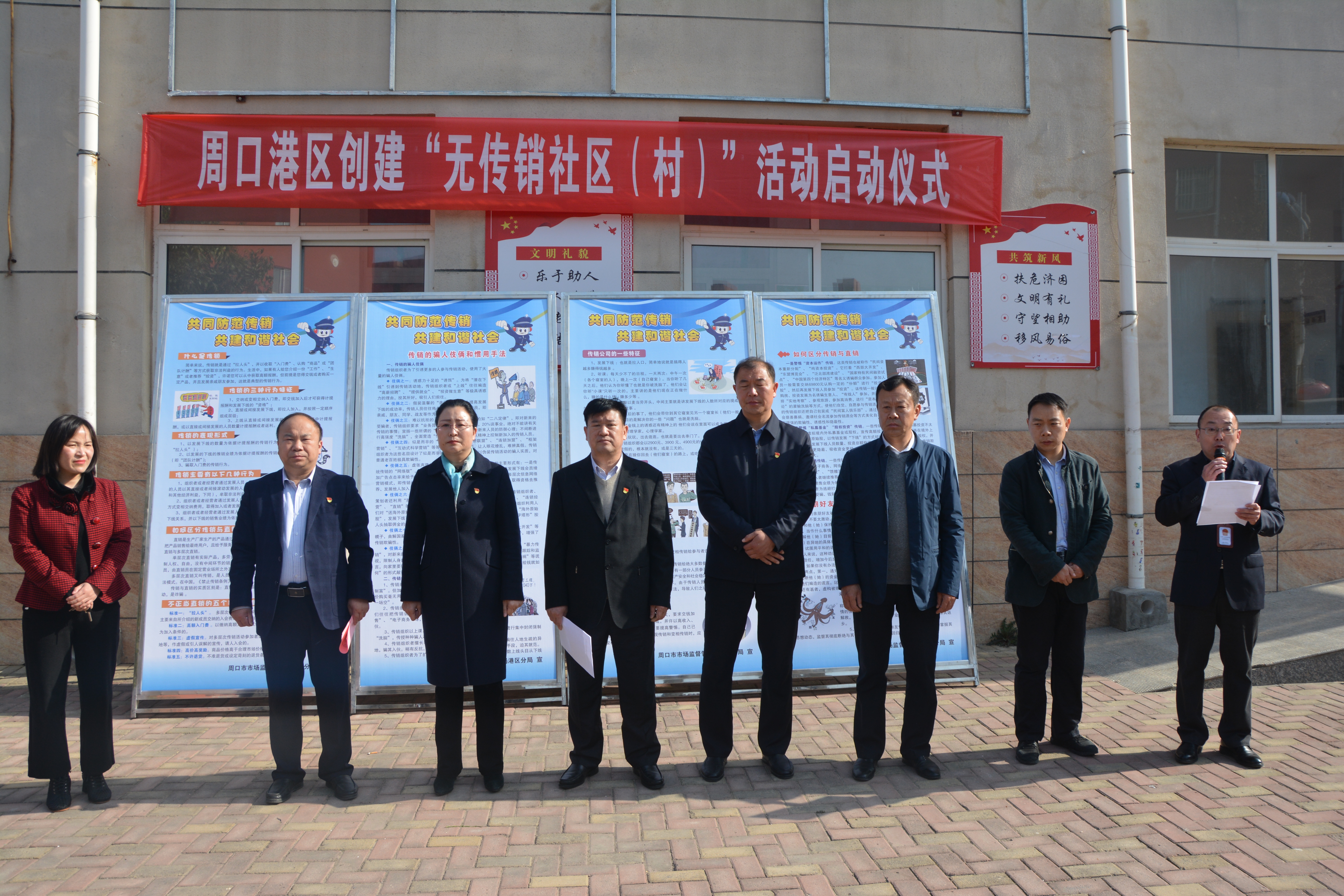 市市場監(jiān)管局二級高級主辦王樹平,港區(qū)打擊傳銷工作領(lǐng)導(dǎo)小組組長、黨委委員、紀(jì)委書記李素芹出席活動,市市場監(jiān)管局公平交易科科長豐亞偉、主任科員孟金鳳,港區(qū)管委會維穩(wěn)創(chuàng)新辦、安全辦、李埠口鄉(xiāng)政府負(fù)責(zé)人,周口市公安局港區(qū)分局民警輔警代表、各行政村分管同志、三個小區(qū)物業(yè)公司代表,市場監(jiān)管局港區(qū)分局全體同志,周口日報社等新聞單位以及前來參觀的群眾參加了活動。港區(qū)打擊傳銷工作領(lǐng)導(dǎo)小組辦公室主任、市場監(jiān)管局港區(qū)分局局長崔健作創(chuàng)建動員講話。他指出,嚴(yán)厲打擊傳銷違法行為,增強(qiáng)廣大群眾識別傳銷、抵制傳銷的能力,發(fā)動社會力量群防群控,是加強(qiáng)平安建設(shè),打造平安港區(qū),進(jìn)一步促進(jìn)社會和諧穩(wěn)定的重要舉措。開展無傳銷社區(qū)村創(chuàng)建活動,就是動員全社會特別是基層派出所、市場監(jiān)管所、社區(qū)(村)等力量,展開群防群控,重點(diǎn)加強(qiáng)對流動人口密集、情況復(fù)雜區(qū)域的檢查力度,形成縱橫交錯、內(nèi)外結(jié)合、上下聯(lián)動的網(wǎng)格體系,全力擠壓傳銷活動生存空間,始終保持對傳銷的高壓態(tài)勢,增強(qiáng)群眾抵制傳銷的自覺性和積極性,鏟除傳銷滋生的土壤,推進(jìn)打擊傳銷工作再上新臺階。