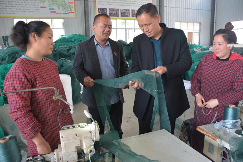 3月27日,商水縣平店鄉(xiāng)李崗村“商水縣龍巢網(wǎng)業(yè)公司”經(jīng)理羅國昌向村黨支部書記李金棋(左二)介紹漁網(wǎng)編織產(chǎn)業(yè)產(chǎn)銷帶貧情況。羅國昌和妻子劉清華2009年創(chuàng)辦漁網(wǎng)編織加工廠、2017年擴(kuò)建新區(qū),現(xiàn)有3個大型生產(chǎn)車間庫房,發(fā)展30多個分廠、40多個聯(lián)系點,年產(chǎn)各種成品漁網(wǎng)500萬條,產(chǎn)品銷往國內(nèi)江蘇、安微、山東、河北、湖北等10多個省區(qū)和30多個沿??h市水產(chǎn)公司,部分出口到俄羅斯及東南亞地區(qū),年創(chuàng)產(chǎn)值約1.6億元,精準(zhǔn)幫扶225戶群眾脫貧,帶貧群眾有1萬余人。