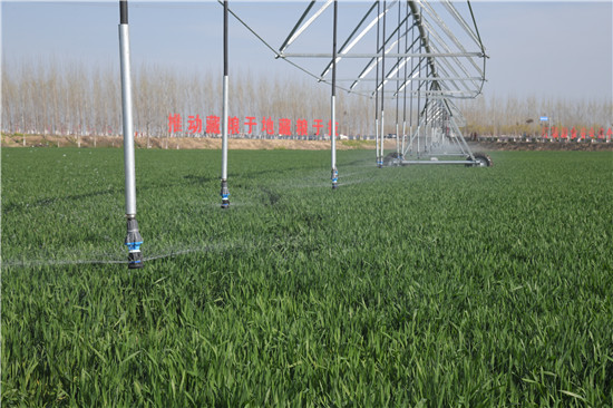 3月28日,商水縣天華合作社調(diào)試中的自走式節(jié)水灌溉設備正在噴水。