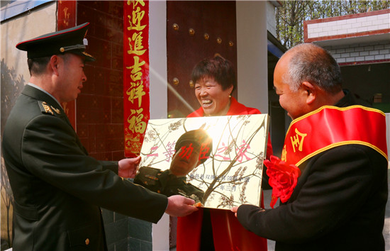 “來(lái)啦,來(lái)啦!”在鏗鏘激越的鑼鼓聲中,鹿邑縣人武部政委李峰、退役軍人事務(wù)局有關(guān)領(lǐng)導(dǎo)和賈灘鎮(zhèn)黨委、政府負(fù)責(zé)人一行人高舉“一人立功、全家光榮”的條幅闊步前來(lái),共同將二等功臣馮秋月的立功喜報(bào)和“二等功臣之家”牌匾、獎(jiǎng)金、慰問(wèn)品送到了她父母手中。村民紛紛趕來(lái)涌進(jìn)軍屬的庭院,為功臣馮秋月點(diǎn)贊,向她的家人鼓掌祝賀。