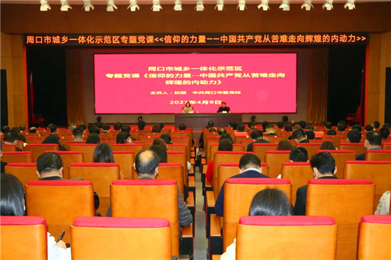 為貫徹落實(shí)習(xí)近平總書記黨史學(xué)習(xí)教育動員大會重要講話精神,全面推進(jìn)全區(qū)黨史學(xué)習(xí)教育工作,4月9日上午,周口市城鄉(xiāng)一體化示范區(qū)組織專題黨課學(xué)習(xí),邀請中共周口市委黨校黨史黨建教研室主任,副教授紀(jì)穎講授《信仰的力量——中國共產(chǎn)黨從苦難走向輝煌的內(nèi)動力》專題黨課,示范區(qū)副處級以上干部、區(qū)直全體黨員干部、鄉(xiāng)、辦、站、所負(fù)責(zé)人、全體村(社區(qū))支部書記參加會議。