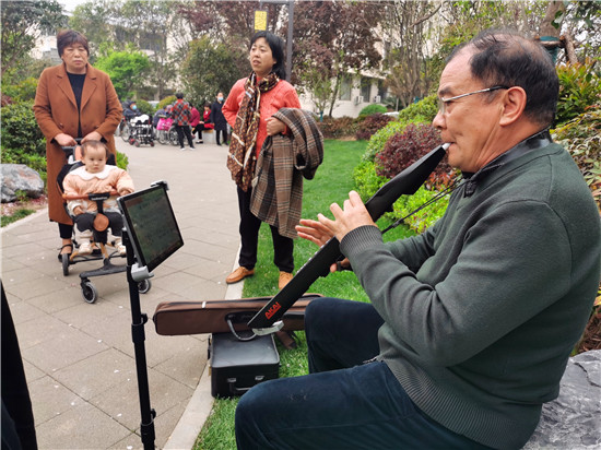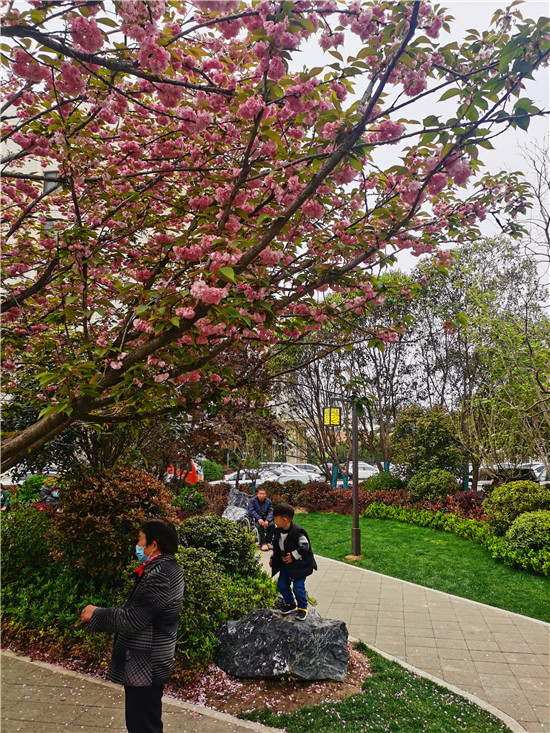 4月12日,中心城區(qū)文明路與七一路交叉口的街頭游園內(nèi),櫻花盛開,綠坪如茵,老人們?cè)谧詩(shī)首詷?lè),很是幸福愜意。