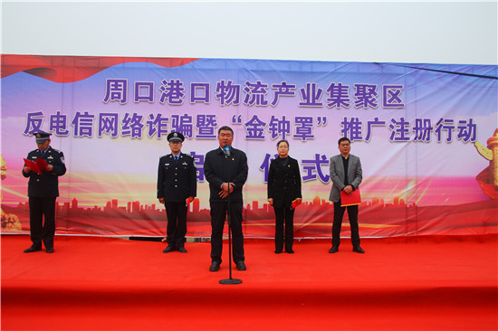 為打擊治理電信網(wǎng)絡(luò)詐騙犯罪,降低詐騙案件發(fā)生率,4月13日,周口港區(qū)舉辦反電信網(wǎng)絡(luò)詐騙宣傳暨“金鐘罩”推廣注冊(cè)行動(dòng)啟動(dòng)儀式,宣傳反電詐知識(shí),推廣公安部門推出的反詐騙系統(tǒng)平臺(tái)“金鐘罩”。港區(qū)黨委書記孫鵬到場(chǎng)宣布行動(dòng)正式啟動(dòng),港區(qū)黨委委員、紀(jì)委書記李素芹,公安分局局長(zhǎng)康群泉在儀式上講話。
