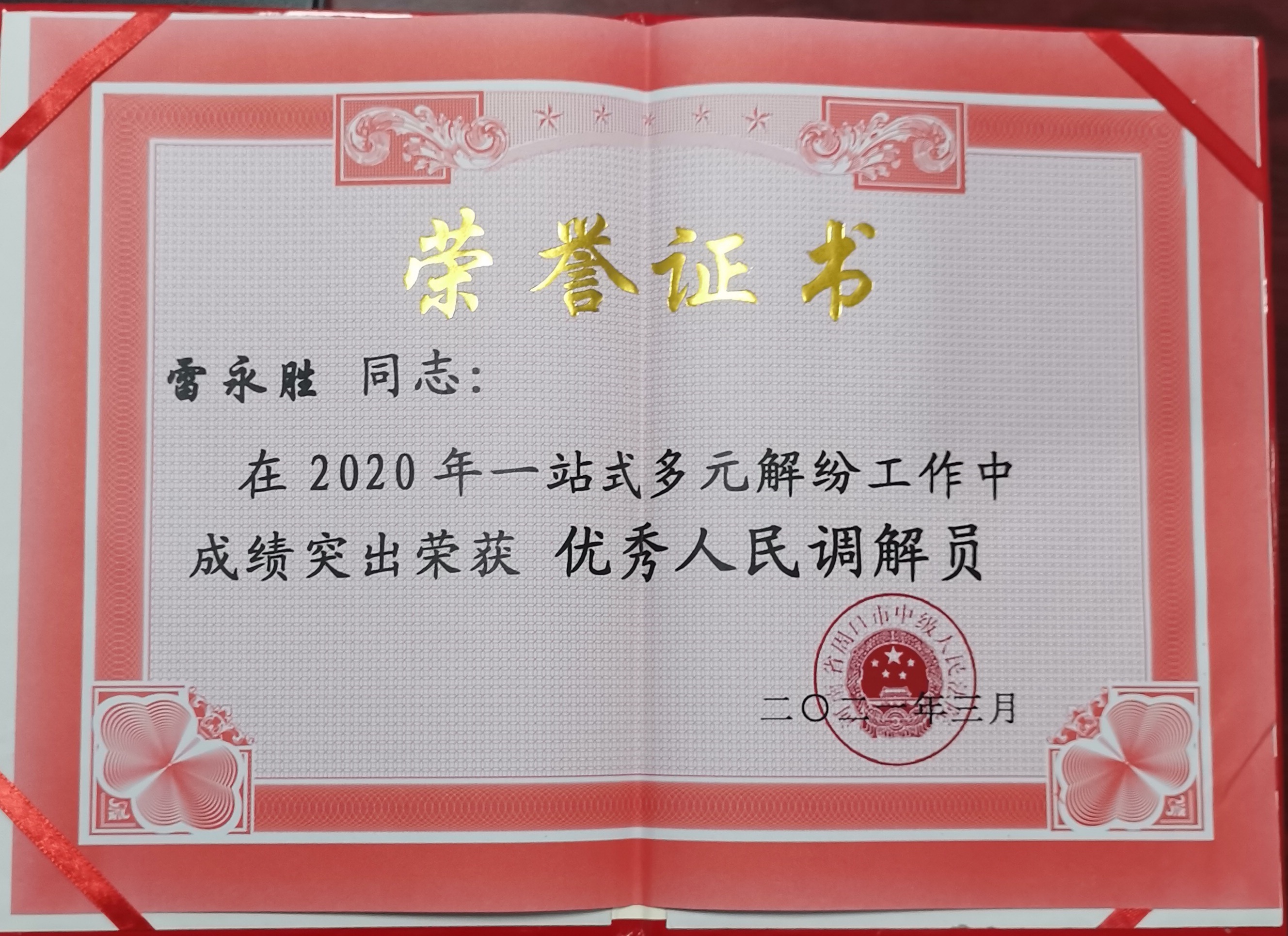 自2020年5月以來,雷永勝調(diào)解員已累計(jì)接受各類案件近200件,成功調(diào)解近百件,助力法院訴前調(diào)解工作邁入先進(jìn)行列,化解了大量社會(huì)矛盾,為維護(hù)社會(huì)和諧穩(wěn)定作出了積極貢獻(xiàn)。日前,雷永勝被周口市中級法院評為“2020年度優(yōu)秀人民調(diào)解員”。