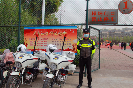 活動(dòng)計(jì)劃是上午9時(shí)開(kāi)始,朱衛(wèi)兵帶領(lǐng)鐵騎隊(duì)從早上7點(diǎn)就來(lái)到校園周邊布置崗哨,對(duì)鄲城一高周邊的校園路、公園東路、一高北路、一高東路、公園北路進(jìn)行車輛引導(dǎo),共出動(dòng)警力46人,警車一部,警用摩托車21輛,形成了各路口有崗、50米一哨。一方面確保車輛有序停放,另一方面守護(hù)師生和家長(zhǎng)安全。