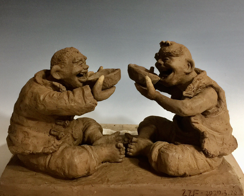 隨后,張振福又介紹了近期創(chuàng)作的慶祝中國(guó)共產(chǎn)黨成立100周年紅色主題泥塑《征途漫漫》《長(zhǎng)在黨旗下》《淮海戰(zhàn)役》《一個(gè)蘋(píng)果的故事》等。李尚武贊賞張振福泥塑風(fēng)格獨(dú)特、主題鮮明,傳遞了正能量,作品具有思想性、藝術(shù)性,充滿(mǎn)鄉(xiāng)情味、泥土味。