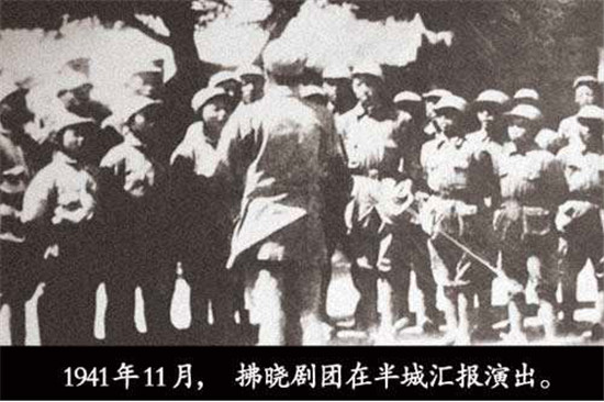 1938年深秋,劇團(tuán)到泌陽(yáng)縣鄧莊鋪演出,群眾自動(dòng)地找木棍、找門(mén)板、挖土埋柱子,很快搭起一座戲臺(tái),掛上幕布,點(diǎn)燃油燈,男女老少坐在戲臺(tái)前的空地上。戲臺(tái)上先是演員們合唱抗日歌曲《新四軍軍歌》《游擊隊(duì)歌》《到敵人后方去》等,后演出話(huà)劇《突擊》。當(dāng)劇中的老爺爺抱著被日寇殺死的孩子,含淚控訴敵人的暴行時(shí),臺(tái)下的觀眾禁不住地憤怒高呼:“打倒日本帝國(guó)主義!把日本鬼子趕出中國(guó)!”1939年11月初,徐海東隨劉少奇由竹溝到華中路過(guò)新興集,彭雪楓命拂曉劇團(tuán)組織一個(gè)晚會(huì),以示熱烈歡迎。拂曉劇團(tuán)接受任務(wù)后,大家爭(zhēng)分奪秒,只用了一天時(shí)間,就集體創(chuàng)作排練出京劇《徐海東粉碎日寇“掃蕩”》,第二天就在歡迎晚會(huì)上演出。