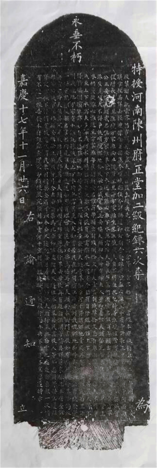 說它“緘默不語”,其實并不準確。這通石碑通體有字,碑的陽面為清同治八年四月十六日淮沈項分縣縣丞孫茂悟所刊刻的嚴禁溜夫訛索客船事告示,碑的陰面為附文,內容為重刊的清嘉慶十七年十一月二十六日陳州知府李振翥制定的嚴禁溜夫訛索客船事章程,是對公告內容的重申,兩面碑文內容大致相同,加起來共有1100余字,均為約束溜夫行為的公告或章程。碑首追刻的有四個大字:永垂不朽。