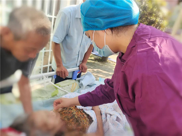 接到派單后,心血管二病區(qū)護(hù)士長孫娜第一時(shí)間與患者家屬取得聯(lián)系,得知這位近百歲的老人是在凌晨一點(diǎn)多自行把胃管拔了出來,早晨還沒有進(jìn)食,于是帶著護(hù)士陳珍珍第一時(shí)間趕往了患者家里。還未下車,她們就看到患者家屬在門口著急地張望:“怎么這么快,太好了,我的老母親不用餓肚子了?!?/p>
